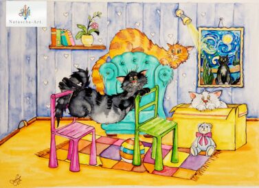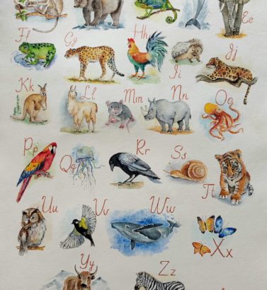 Nach Deutschland übersiedelte sie 2004. Jetzt hatte sie damit zu tun, sich zu integrieren, die deutsche Sprache zu erlernen und für ihre Familie da zu sein. Das Malen aber hatte Natalie niemals aufgegeben, denn das Malen ist ihre Welt, ihr Leben, ihre Intuition. Und so bildeten sich über die Jahre verschiedene Richtungen heraus, einmal in der Motivsuche und dem Finden von Motiven sowie zum anderen in den Maltechniken. Auslöser ihrer Ideen sind die Menschen, sind Landschaften, Tiere, Körperhaltungen und – bewegungen sowie lustige Momente. Das beflügelt Natalie zu heiteren, vergnüglichen Bildern in schillernden Farbnuancen. Es entstehen Portraits, Stillleben, Bleistiftzeichnungen – mit einem Satz, die Palette der Möglichkeiten ist vielseitig und unbegrenzt. Sie arbeitet mit Stift und Pinsel, teils abstrakt in Acryl und Aquarell. Mit dem sogenannten Sketching wendet sie eine besondere Art des Zeichnens und Malens an, eine Art journalistische Wiedergabe zur künstlerischen Darstellung des wirklichen Lebens. Schnell auf Papier, Karton oder Leinen gebracht ist das Motiv kurzerhand vollendet. Eine Methode, die von Gabriel Canzanario ins Leben gerufen wurde, die sie sich angeeignet hat und die sich u.a. gut für Auftragsarbeiten eignet. Bemerkenswert das Alphabet für Kinder. Hier kombiniert die Künstlerin die sechsundzwanzig Buchstaben des Alphabetes mit Motiven aus der Welt der Tiere.